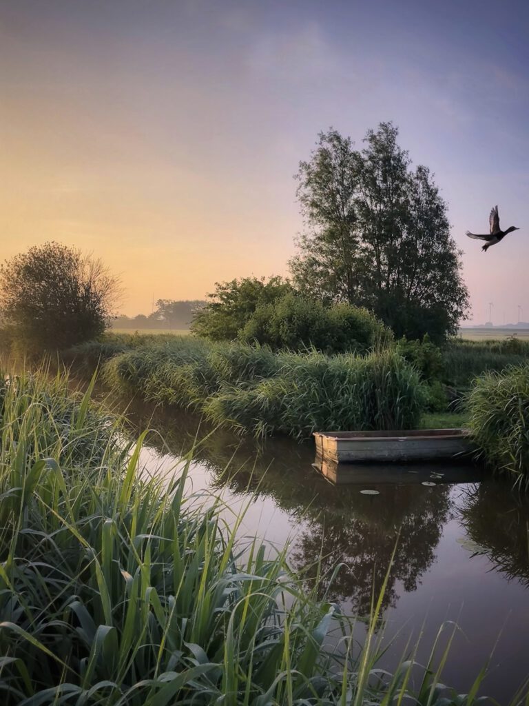 Eén keer stond ik bij een sloot met hoog riet, wachtend op vogels. Ik stond op m’n tenen met mijn armen uitgestrekt omhoog omdat er een bootje lag, en eindelijk kwam er dichtbij een eend voorbij vliegen. Ik nam de foto en dacht even dat ik nèt te laat was, maar dankzij de livefunctie (lange sluitertijd) lukte het om de eend terug in beeld te krijgen, ik was zó blij!( foto)de Eend
