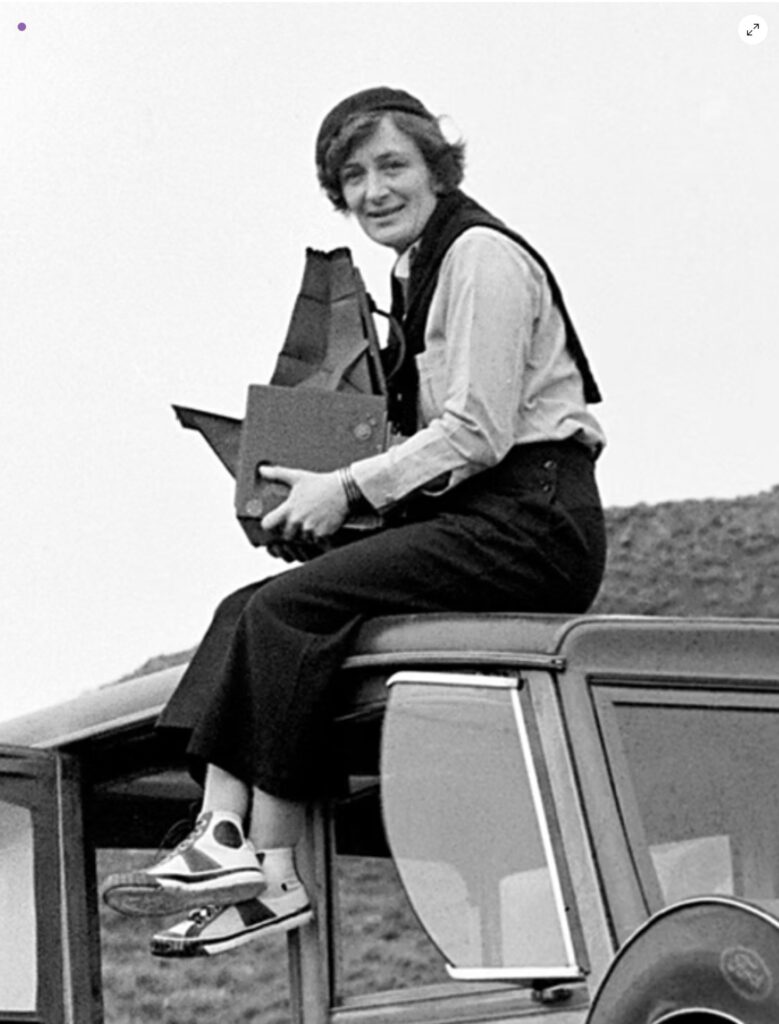 Foto: Dorothea Lange met een Graflex Kamera op een Ford V8 in (1936)