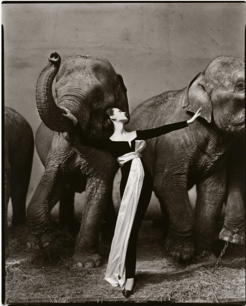 Beroemdste foto: Dovima with Elephants, Evening Dress by Dior, Cirque d’Hiver, Paris (1955)