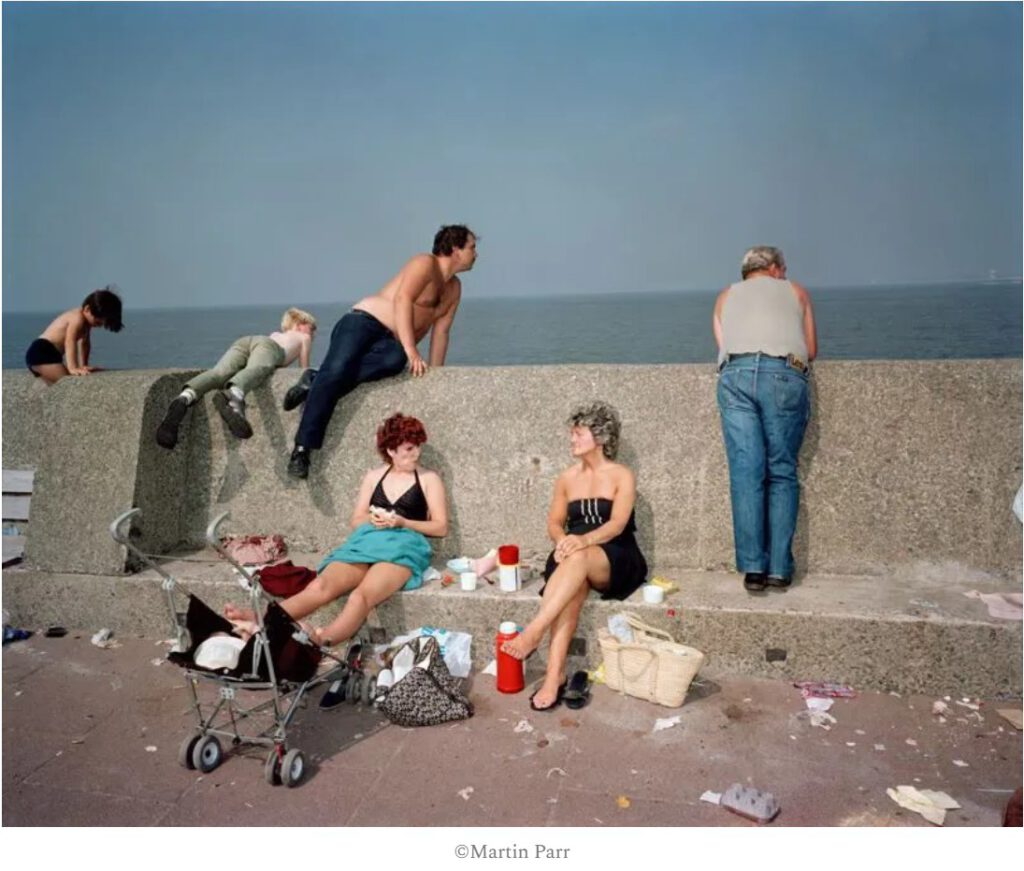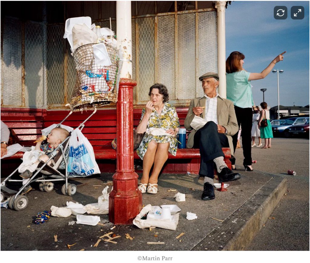 De beelden hadden een opvallende eerlijkheid: moeders die op klapstoelen zaten en peuters voedden met vingers vol ketchup, vaders die wegdommelden in ligstoelen onder een grijze, bewolkte hemel. Zoals Parr zelf ooit zei: “Ik maak serieuze foto’s vermomd als entertainment.” Onder de felle kleuren en de ogenschijnlijke luchtigheid hield zijn werk de samenleving een spiegel voor.
