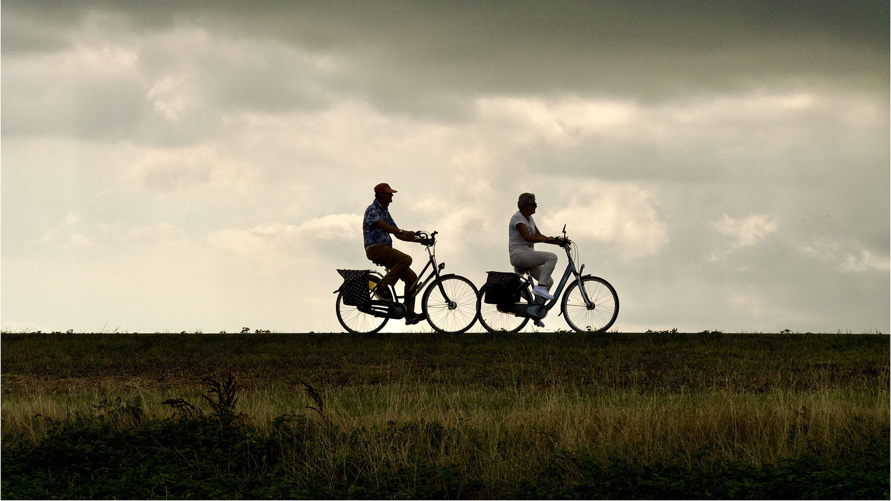 Twee oudere mannen staan binnen en bekijken elk een tijdschrift terwijl ze een gesprek lijken te voeren. Op de achtergrond zijn meer mensen en een verlicht display met tekst zichtbaar.